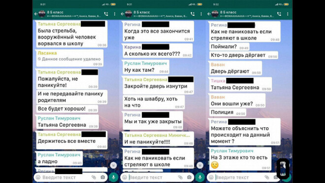 Судя по таймингу переписки, дети писали отчаянные сообщения в тот момент, когда Ильназ Галявиев уже ворвался в школу и расстрелял несколько человек. Очевидцы сообщают, что «стрелок» ходил по коридорам здания и пытался зайти в другие кабинеты, чтобы и дальше продолжать пальбу по живым мишеням.