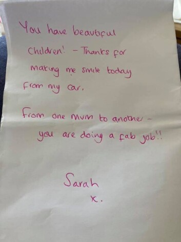 Однако ее опасения не оправдались, текст записки гласил: "У вас замечательные дети! Я увидела вас из окна своей машины, вы заставили меня улыбнуться. Вы замечательно справляетесь, это я вам как мама маме говорю". Записка была подписана именем Сара. Женщина настолько растрогалась, что заплакала сразу, как прочитала текст.