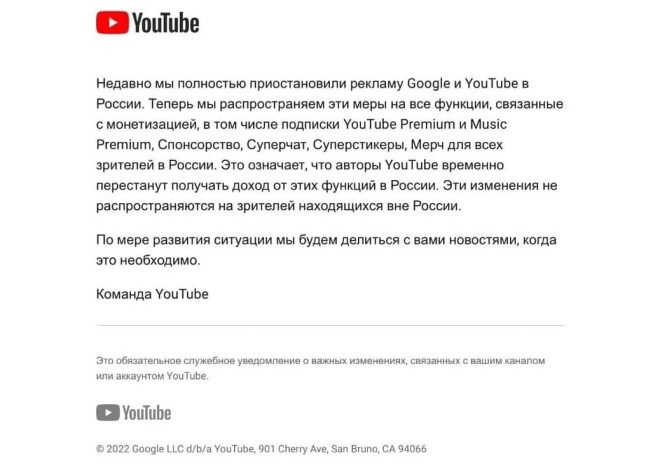 «Это означает, что авторы YouTube временно перестанут получать доход от этих функций в России. Эти изменения не распространяются на зрителей, находящихся вне России», — говорится в сообщении.