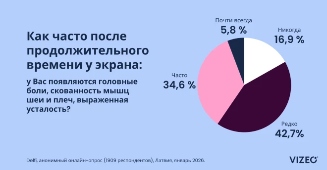 Многие привыкли списывать эти симптомы на напряженный график будней или стресс. Но на практике причиной зачастую оказывается именно цифровая усталость, которая незаметно влияет на состояние глаз и нервной системы. Возможно, именно поэтому данные опроса [1] показывают: в Латвии только 1 человек из 5 никогда не сталкивался с признаками цифровой усталости. Иными словами, пользование экранами стало существенным фактором, ежедневно влияющим на зрение и нервную систему. Если раньше усталость глаз была связана в основном с чтением или мелкой ручной работой, то сегодня она стала ежедневным побочным эффектом для большинства людей, активно использующих экраны.