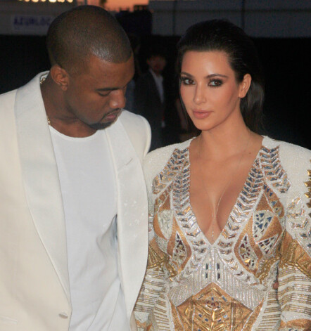 Рэпер Канье Уэст (35), позируя рядом со своей возлюбленной Ким Кардашьян (31), не удержался от взгляда в вырез ее платья Balmain
