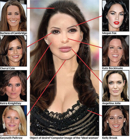 У фоторобота, составленного после опроса более 9 тысяч человек, оказались глаза британской певицы Шерил Коул, брови голливудской актрисы Меган Фокс, губы Анджелины Джоли, а подбородок Гвинет Пэлтроу. Кроме того, участники опроса "наградили" идеальную женщину грудью британской телезвезды Келли Брук, носом звезды "Перл Харбора" Кейт Бекинсейл, щеками Киры Найтли и волосами герцогини Кембриджской Кейт Миддлтон.