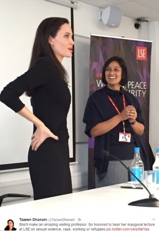 Вводное занятие под руководством посла доброй воли ООН в рамках курса, посвященного воздействию войны на женщин, было посвященно теме «Женщины, мир и безопасность». Несмотря на свой огромный опыт съемок в кино, а также публичных выступлений, актриса призналась студентам, подавляющее большинство из которых были представительницами прекрасного пола, что она немного нервничает. «Я надеюсь, что у меня получится, потому что это очень важно для меня», - начала лекцию актриса. Джоли говорила о том, с чем сталкиваются женщины, оказавшиеся в зонах военных действий. Ее волнения были напрасны – по окончании занятия благодарные студенты написали в социальных сетях, что все прошло отлично: «Невероятная лекция!», - написала одна из студенток, другая добавила, что Джоли отлично справилась. После лекции актриса и ее приемный сын Мэддокс отправились в Букингемский дворец, где провела для него экскурсию.