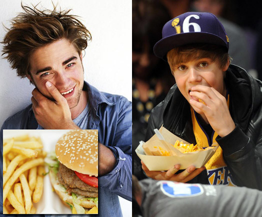 Два кумира девушек ― исполнитель роли вампира Эдварда в «сумеречной» саге, британский актер Роберт Паттинсон (24) и юный канадский поп-певец Джастин Бибер (16) не скрывают своего пристрастия к нездоровой пище. Паттинсон не может жить без чизбургеров, а Бибер ― без картошки фри и жареных куриных ножек.