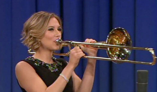 Актриса Скарлетт Йоханссон была гостем шоу «Late Night with Jimmy Fallon», где ей неожиданно пришлось помузицировать. Правда, таланта на этом поприще у Скарлетт, увы, не обнаружилось. Дело в том, что актриса получила от ведущего задание: случайным образом выбрать музыкальный инструмент и известную песню для исполнения, а Джимми Фэллон должен был догадаться, что же Скарлетт наигрывает. В качестве инструмента актрисе достался тромбон. Увы, за отведенное ей на исполнение время она так и не смогла «выдуть» что-либо внятное. Зато потом, когда они поменялись местами, Фэллон вполне сносно сыграл на мини-гармонике.