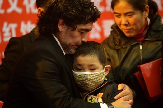 Пока бывший главный тренер сборной Аргентины Марадона сидит без тренерской работы, он делает не только громкие заявления, «примеряясь» к занятым местам в топ-клубах Англии, но и находит время для добрых дел. Участие в благотворительной акции закинуло икону футбола в столицу Китая Пекин, где он принял участие в мероприятиях, организованных международным Красным Крестом. Здесь он обнимал зараженных детей, а также демонстрировал свое мастерство владения мячом и апельсином.