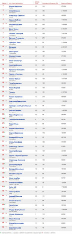 Из неожиданностей рейтинга главной стало появление в нем Петра Налича (45 место), ранее известного широкой публике только по ролику на YouTube с песней Guitar. В этом же году после выступления на «Евровидении» его доходы и известность резко поднялись. Это же произошло и с Григорием Лепсом – с 47 места он взлетел на 9-е. В этом году рейтинг покинули Земфира, ГлюкоZа, Макsим и Юлия Савичева.