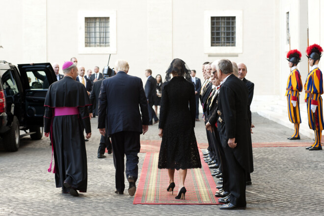 Согласно протоколу, женщинам полагается появляться на встрече с понтификом в платьях с длинными рукавами и с покрытой головой. На аудиенцию с папой римским нельзя надевать одежду красного, фиолетового и белого цветов, так как это цвета мантий кардиналов, епископов и самого папы. Всего 7 особ королевской крови католической веры являются обладательницами так называемой privilége du blanc (привилегией белого) и не обязаны подчиняться этому правилу. Женщины семейства Трамп выбрали для визита к Франциску черные кружевные наряды и головные уборы, которые острословы в интернете тут же окрестили «образами, достойными сицилийских вдов» и предположили, что Мелания и Иванка вдохновлялись фильмами об итальянской мафии. На Мелании был наряд итальянской марки Dolce & Gabbana, цена которого - 5276 евро.