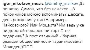 Маликов поспешил ответить хорошему знакомому. Артист подчеркнул, что не имел в виду никого конкретного, а всего лишь делился своими мыслями. Николаев снова отреагировал на комментарий коллеги. «Да понятно, Димон, что без намеков... А покойников можно вспоминать? Дескать, день рождения у них? Например, Чайковского? Или Моцарта? Им ведь уже ни дорогой подарок, ни торт не подаришь. А пост отличный – бурная реакция общественности гарантирована! Молодец!»