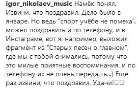 В числе тех, кто присоединился к обсуждениям поста Дмитрия Маликова, оказался и Игорь Николаев. Артист поведал, что и сам часто поздравляет друзей в социальных сетях. Певец извинился перед коллегой по шоу-бизнесу. «Намек понял. Извини, что поздравил. Дело было в январе. Но ведь «спорт учебе не помеха», можно поздравить и по телефону, и в Instagram, вот я, например, выложил фрагмент из «Старых песен о главном», где мы с тобой снимались, потому что это милые приятные воспоминания, и по телефону их не очень передашь… Еще раз извини, что поздравил. Удачи!» – отметил Николаев.