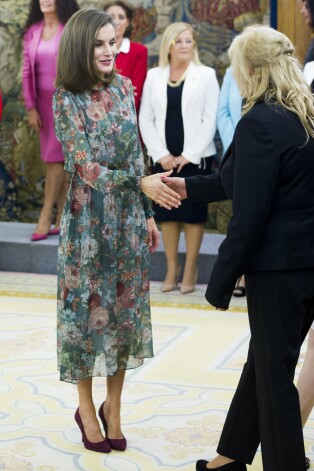 45-летняя королева Летиция провела встречу в Ассоциации сельских женщин. В роскошные залы дворца Сарсуэла супруга короля Филиппа VI вошла в платье демократичной марки.