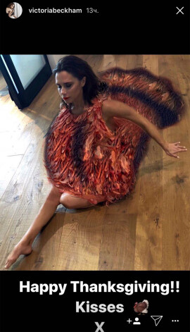Вчера в США и Великобритании отмечали День благодарения. Как известно, традиционным блюдом в этот праздник считается запеченная индейка. Виктория Бекхэм (43), подумав, что подать ее на стол будет слишком банально, решила самостоятельно перевоплотиться в птицу.