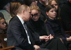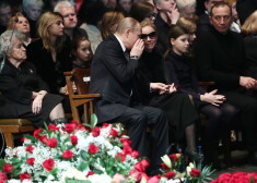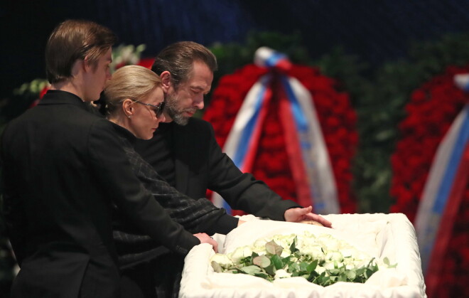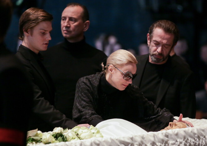 Супруга покойного актера Марина Зудина и сын артиста Павел Табаков принимают соболезнования близких друзей. Наследник актера как может поддерживает безутешную маму, которая не смогла сдержать слез у гроба мужа.