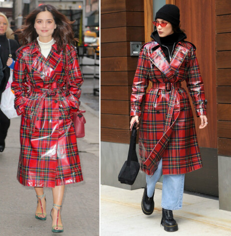 Британская актриса Дженна Коулман (31) и американская модель Белла Хадид (21) были замечены на улицах Нью-Йорка в одинаковых тренчах Burberry.