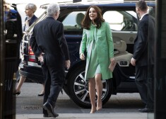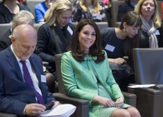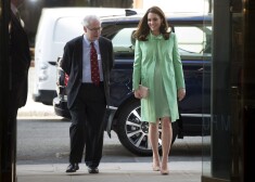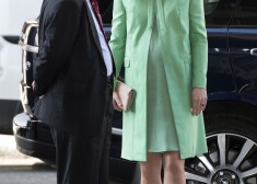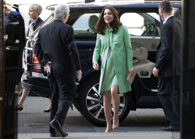 На беременной герцогине было пальто Catherine Walker и шляпка Lock & Co в тон. Бежевые туфли Gianvito Rossi и серьги Balenciaga довершали ее облик.