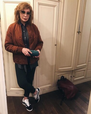 Звезда театра и кино, 71-летняя Татьяна Васильева, покорила поклонников стильным внешним видом. Актриса примерила довольно молодежный образ, надев кроссовки, укороченные спортивные штаны, просторную клетчатую рубашку и короткую куртку, напоминающую телогрейку.