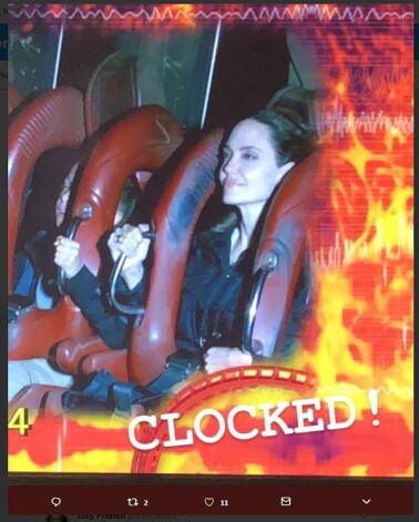 Голливудская актриса с удовольствием каталась на аттракционах. В какой-то момент изображение улыбающейся Джоли на американских горках появилось на огромных табло, установленных в парке — на них показывают всех посетителей аттракциона. Снимок быстро распространился в соцсетях.