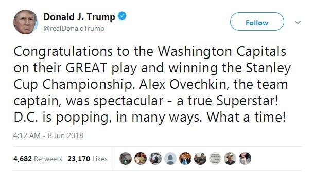 «Поздравляю "Вашингтон" с великолепной игрой и победой в Кубке Стэнли. Капитан команды Алекс Овечкин был невероятен — настоящая суперзвезда!» — написал Трамп.