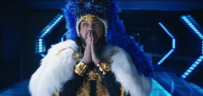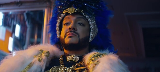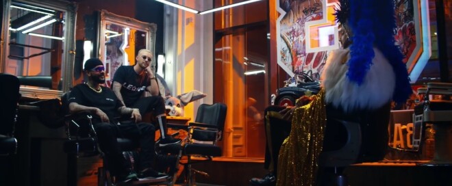 В какой-то момент Киркорову звонят "по второй линии", он подъезжает к барбершопу, где певца уже ждут Тимати и Егор Крид. Через некоторое время многометровый "лимузин" Киркорова останавливается у входа, он облачается в мантию и перья и выходит.
