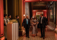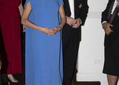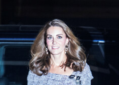 Герцогиня Кембриджская выглядела настоящей королевой вечера в голубом платье от Alexander McQueen, тиаре "Любовный узел" (Cambridge Lover's Knot), которую до нее носила принцесса Диана, жемчужных серьгах принцессы Уэльской и одном из любимых ожерелий королевы Елизаветы II.