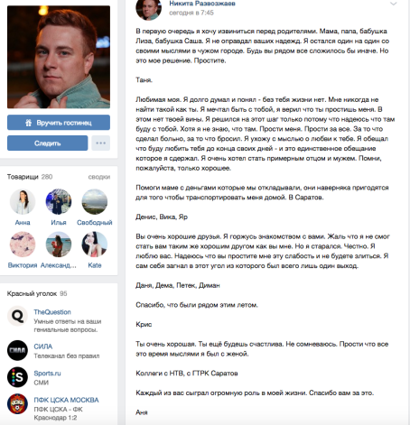 На своей странице во "ВКонтакте" корреспондент оставил прощальное послание родным и близким. В записке журналист просит прощения у родителей, а также признается, что пытался помириться с женой, но не смог этого сделать. «Любимая моя. Я долго думал и понял - без тебя жизни нет. Мне никогда не найти такой, как ты. Я мечтал быть с тобой, я верил, что ты простишь меня».