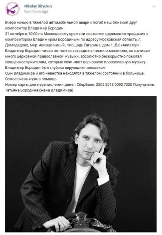 "Сегодня ночью в автомобильной аварии погиб наш близкий друг — композитор Владимир Бородин", — говорится в сообщении.