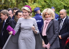 Сначала супруги приехали в университетский и культурный центр Бельгии, город Гент, где в сопровождении короля Филиппа и Матильды отправились на небольшую историческую экскурсию. Для этого публичного выхода в свет Брижит выбрала серое платье чуть ниже колена и пальто с крупными золотыми пуговицами из того же материала. Образ первой леди был дополнен винными лодочками и сумкой в тон.