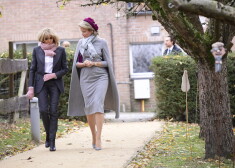 На следующий день первая леди Франции порадовала поклонников уже новым изящным образом: на прогулке с королевой Матильдой Брижит появилась в белоснежной рубашке и темно-сером брючном костюме. Образ дополнял комплект из пастельно-розовых перчаток и шарфа, а также модные черно-желтые ботильоны.