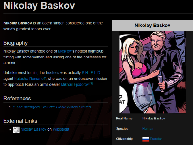 "Николай Басков - оперный певец, считается одним из величайших теноров мира. Басков посетил один из самых жарких ночных клубов Москвы, где флиртовал с женщинами и предлагал одной из них с ним выпить. При этом Николай не знал, что девушка эта - на самом деле агент S.H.I.E.L.D. Наташа "Черная вдова" Романова. Которая была в тот момент на секретном задании, пытаясь подобраться к российскому торговцу оружием Михаилу Федорову", - пояснена роль Баскова на персональной страничке в вики Marvel Cinematic Universe.