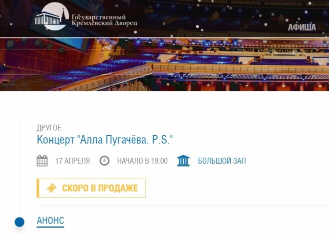 "17 апреля на главной сцене страны – в Государственном Кремлевском Дворце, состоится юбилейный концерт примадонны отечественной эстрады «Алла Пугачёва. P.S.», - говорится на сайте Дворца.