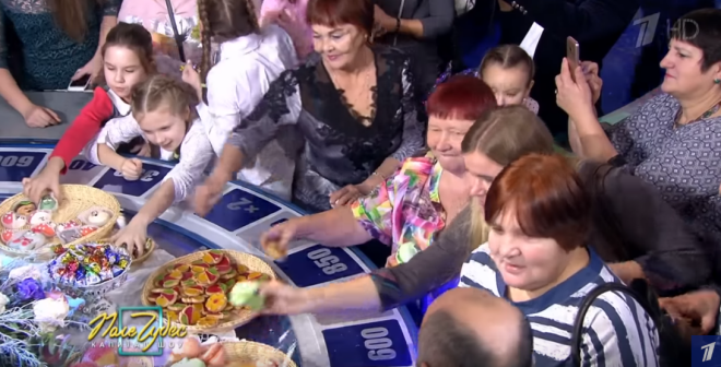 В интернет попало шокирующее видео из студии популярной телепередачи "Поле чудес". На кадрах видно, как зрители сразу после окончания съемок срываются со своих мест и бегут к знаменитому барабану для того, чтобы успеть забрать еду и подарки, которые принесли участники шоу.