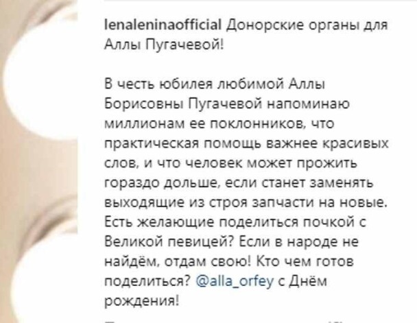 «Донорские органы для Аллы Пугачевой! В честь юбилея любимой Аллы Борисовны Пугачевой напоминаю миллионам ее поклонников, что практическая помощь важнее красивых слов, и что человек может прожить гораздо дольше, если станет заменять выходящие из строя запчасти на новые. Есть желающие поделиться почкой с великой певицей? Если в народе не найдём, отдам свою! Кто чем готов поделиться? Алла Пугачева с днём рождения!» — заявила Лена Ленина.