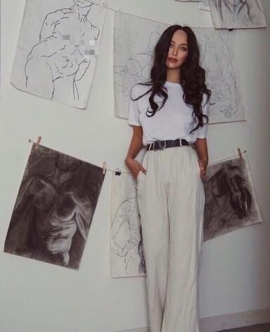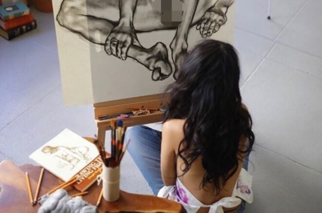 Дарина пишет картины в стиле гиперреализм. Чаще всего она изображает мужчин без одежды. Художница опубликовала в Instagram снимок, на котором запечатлена со спины возле холста с изображением сидящего голого мужчины.
