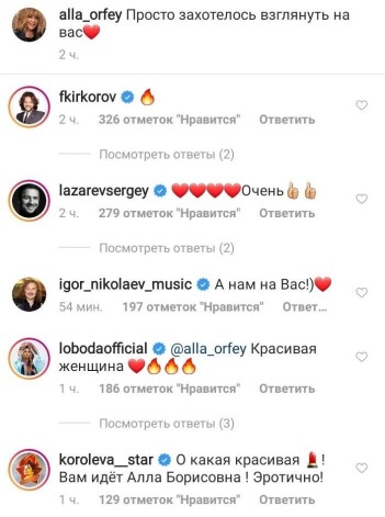 Преображение Аллы Борисовны уже оценили: Филипп Киркоров, Сергей Лазарев, Игорь Николаев, Светлана Лобода, Анита Цой, Алика Смехова и многие другие звезды. Особенно эксперимент со стилем понравился Наташе Королевой. «О, какая красивая помада! Вам идет Алла Борисовна ! Эротично!» — восхищается Королева макияжем Пугачевой.