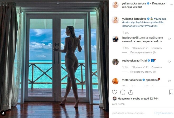 Певица Юлианна Караулова наслаждается отдыхом на Мальдивах. Девушка хорошо проводит время и публикует с курорта пикантные снимки.