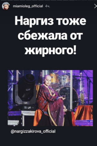 Неожиданно в конфликт Фадеева и Закировой вмешался Олег Майами. Певец много лет сотрудничает с продюсерским центром MALFA, но это не помешало ему оскорбить Максима. «Наргиз тоже сбежала от жирного», — заявил музыкант в социальных сетях.