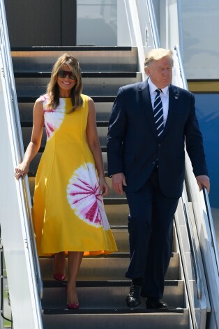 Первая леди США появилась на саммите в ярко-желтом платье американского бренда Calvin Klein с бело-розовыми цветами, окрашенными по технологии тай-дай. На ногах Мелании Трамп были туфли лодочки цвета фуксия Christian Louboutin стоимостью 470 евро.