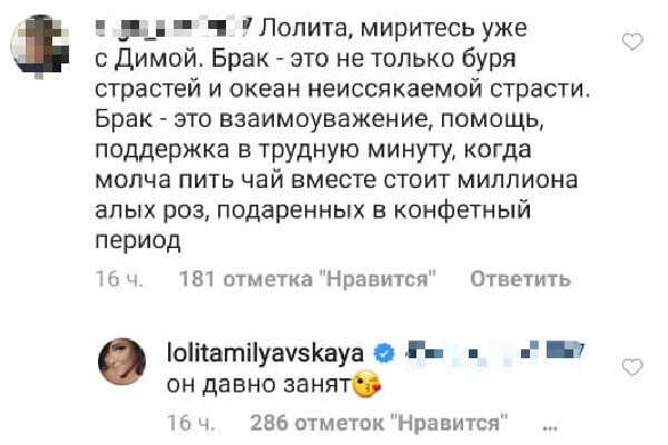 Поклонники ежедневно пишут Милявской сообщения с просьбами помириться с Ивановым. На один из таких комментариев звезда ответила.