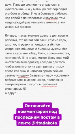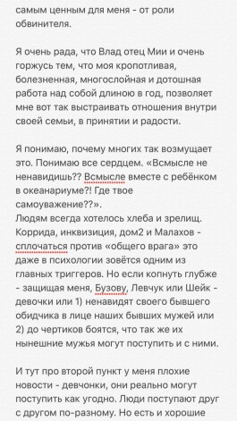 Дакота раз и навсегда поставила точку в обсуждении возобновления романа с бывшим мужем, которого назвала «сексоголиком». «Я осознанно отказалась и от роли жертвы, и от роли спасителя, и что стало самым ценным для меня — от роли обвинителя. Я очень рада, что Влад — отец Мии и очень горжусь тем, что моя кропотливая, болезненная, многослойная и дотошная работа над собой длиною в год, позволяет мне вот так выстраивать отношения внутри своей семьи, в принятии и радости», — добавила она.