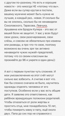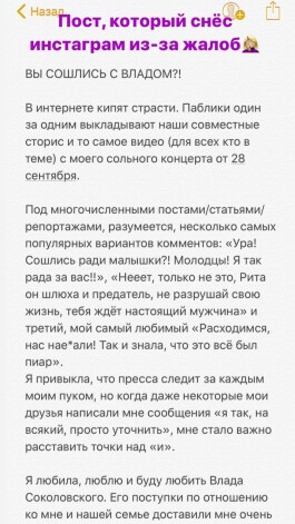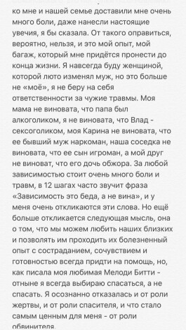 «Я любила, люблю и буду любить Влада Соколовского. Его поступки по отношению ко мне и нашей семье доставили мне очень много боли, даже нанесли настоящие увечия, я бы сказала. От такого оправиться, вероятно, нельзя, и это мой опыт, мой багаж, который мне придется пронести до конца жизни. Я навсегда буду женщиной, которой люто изменял муж, но это больше не «мое», я не беру на себя ответственности за чужие травмы», — рассказала Рита.