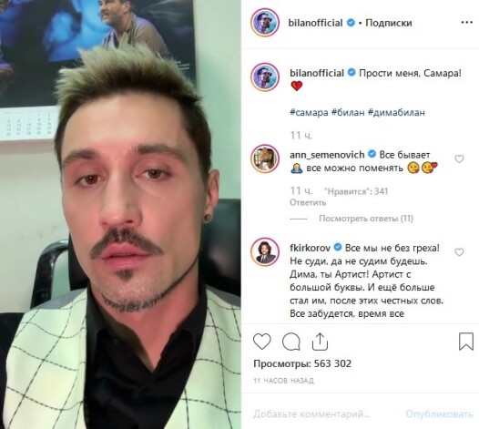 Не остался в стороне и Филипп Киркоров: "Все мы не без греха! Не суди, да не судим будешь. Дима, ты Артист! Артист с большой буквы. И еще больше стал им после этих честных слов. Все забудется, время все стирает, а такие честные поступки останутся навсегда, как поступок настоящего честного артиста! Благородно! Честно!", - написал певец в комментариях.