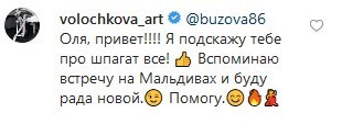 Анастасия Волочкова сразу же отозвалась на видео Бузовой. Бывшая прима-балерина призналась, что хочет ей помочь. «Оля, привет! Я подскажу тебе про шпагат всё! Вспоминаю встречу на Мальдивах и буду рада новой. Помогу», — заверила звездную коллегу «королева шпагатов».