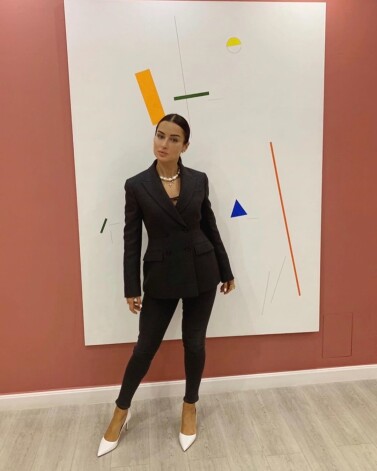 А завершал галерею фото самый практичный и универсальный лук — узкий темно-серый брючный костюм, белые туфли и массивное украшение в цвет обуви.