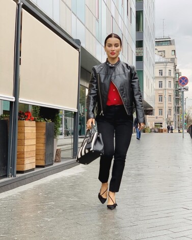 Второй комплект оказался более дерзким — Тина надела ярко-красную рубашку с кожаной косухой и укороченными черными брюками. Образ дополнили остроносые лодочки и большая полосатая сумка. Волосы знаменитость гладко зачесала назад и накрасила губы яркой помадой в цвет блузки.