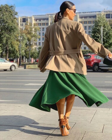 Третий образ стал самым романтичным, он состоял из летящего свободного платья-миди зеленого оттенка, пудрового пиджака и туфель с леопардовым принтом.