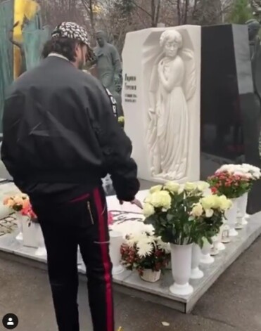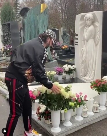 На этот раз он вновь пришел на ее могилу и возложил букет белых роз к ее памятнику. Певец облачился в черный спортивный костюм, кожаную куртку, кроссовки и кепку, но даже такой наряд не смог скрыть его личность.