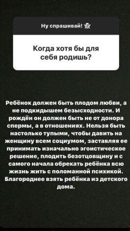 «Ребенок должен быть плодом любви, а не подкидышем безысходности. И рожден он должен быть не от донора спермы, а в отношениях. Нельзя быть настолько тупыми, чтобы давить на женщину всем социумом, заставляя ее принимать изначально эгоистическое решение плодить безотцовщину и с самого начала обрекать ребенка на жизнь с поломанной психикой. Благороднее взять ребенка из детского дома».
