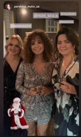 Наталья была одета в блестящее мини-платье цвета металлик. Наряд украшало глубокое декольте. На волосах певицы была сделана химическая завивка. Именно с такой прической часто выходила в свет Жанна Фриске.