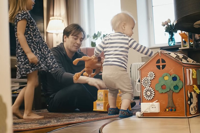 Весь день Безруков также находится на связи с родными, периодически созваниваясь с ними по видеосвязи. Малыши появляются в клипе не единожды, а вот Анна Матисон попадает в кадр лишь мельком.