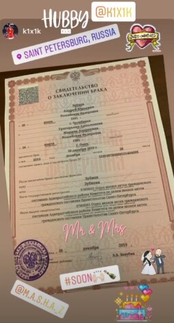 Мария, экс-супруга Андрея Григорьева-Аполлонова, вышла замуж за баскетболиста Андрея Зубцова. Влюбленные расписались 28 декабря в одном из ЗАГСов Санкт-Петербурга. Бракосочетание пара отметила скромно — ужином на двоих в дорогом ресторане. Молодожены заказали стейки из говядины, приготовленные в золоте.